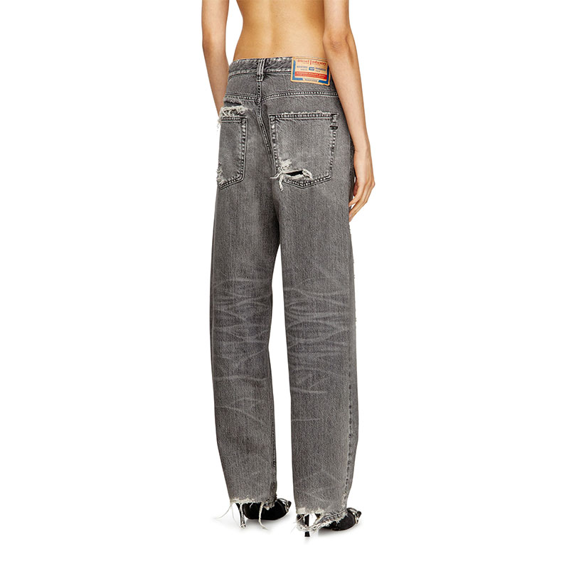 This fix denim is made using regenerative cotton and Distressed in Italy. The grey cast features a DNA destroyed look, with ripped and repaired abrasions that look like the jean has been scraped to reveal the inner construction of the fabric.