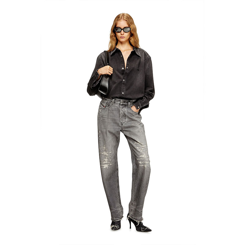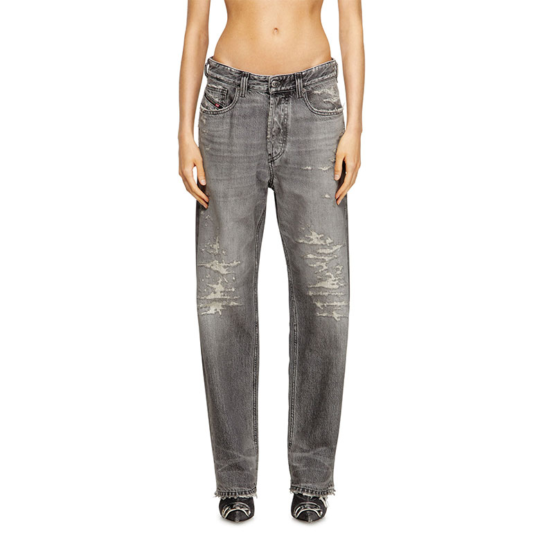 Loose style with a low waist and straight leg. The design is characterised by a cut-off waistband and subtly frayed pockets.