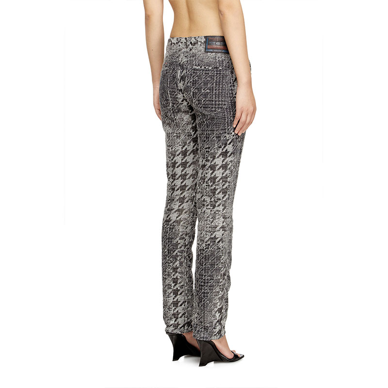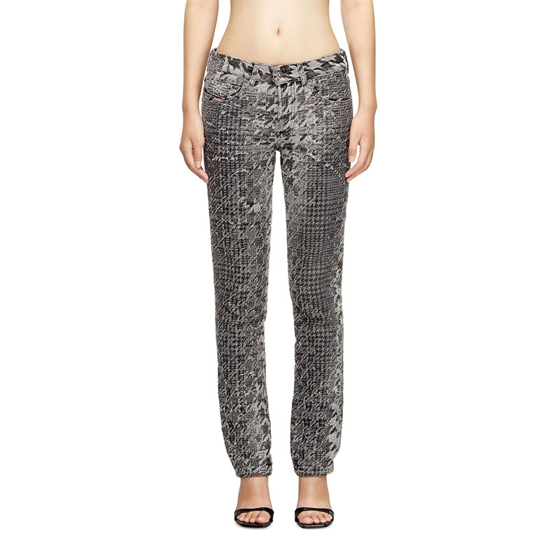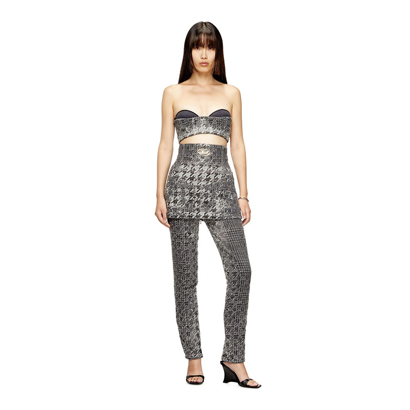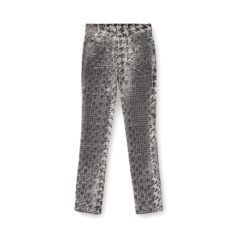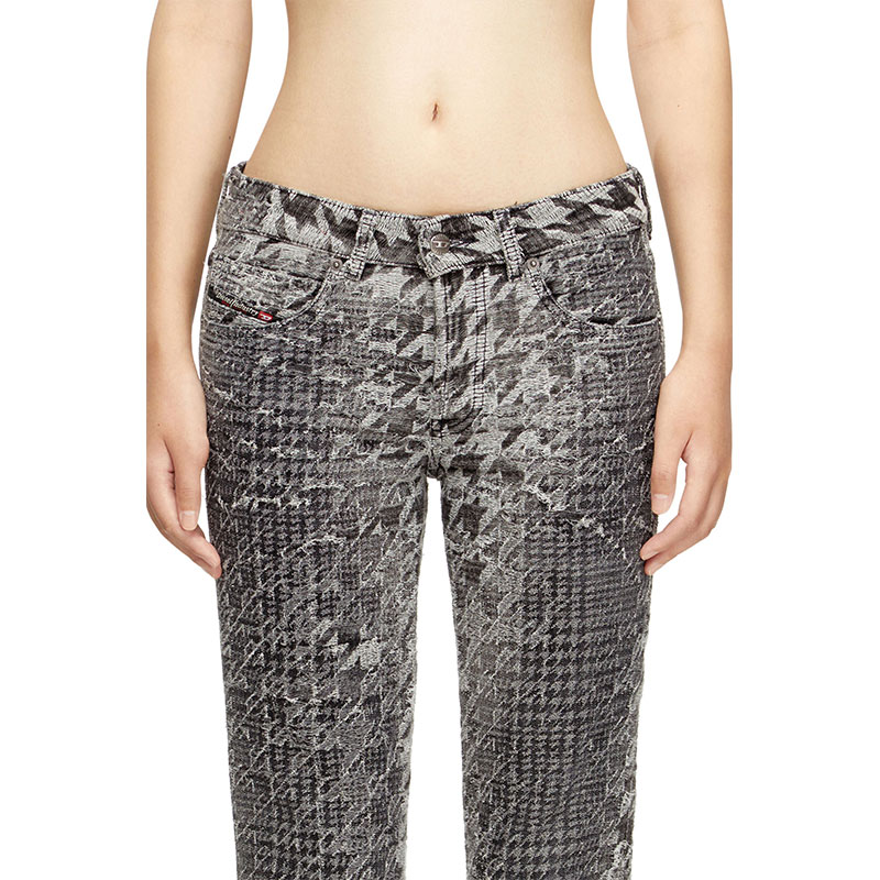 Distressed in Italy, this black fix denim features a distinctive jacquard weave with a double pattern: the houndstooth top layer is burned using a precise laser process to reveal the Prince of Wales motif underneath. Stonewashed with enzymes, this unique worn-in wash is part of the Runway line up, channelling an unconventional haute-couture attitude.