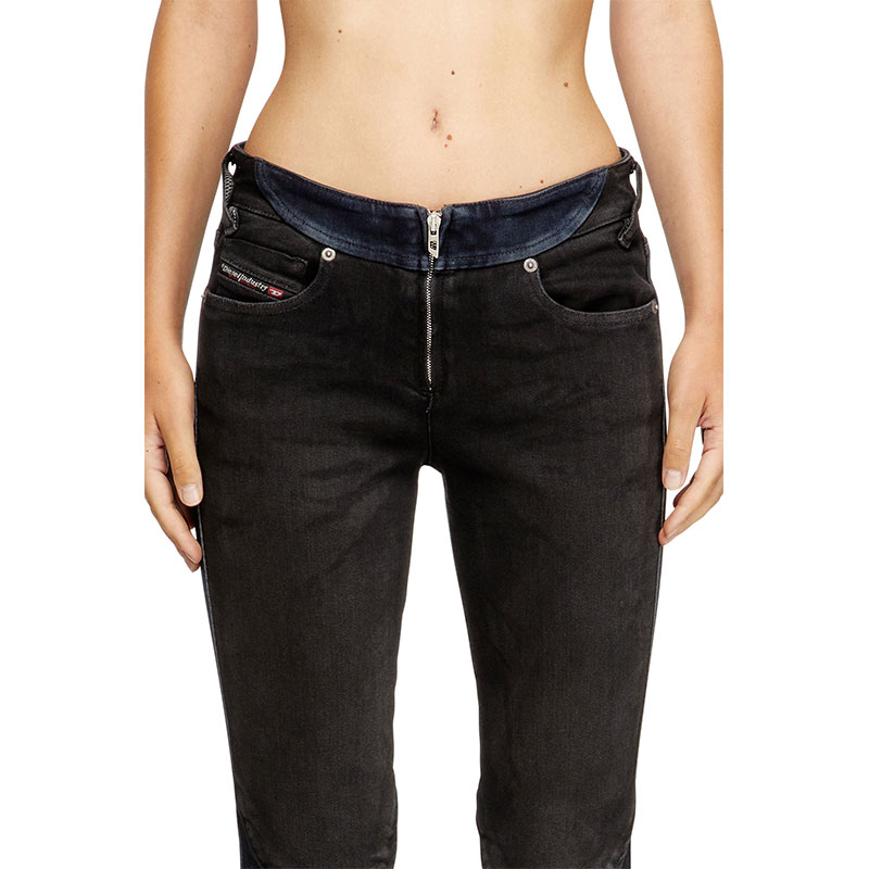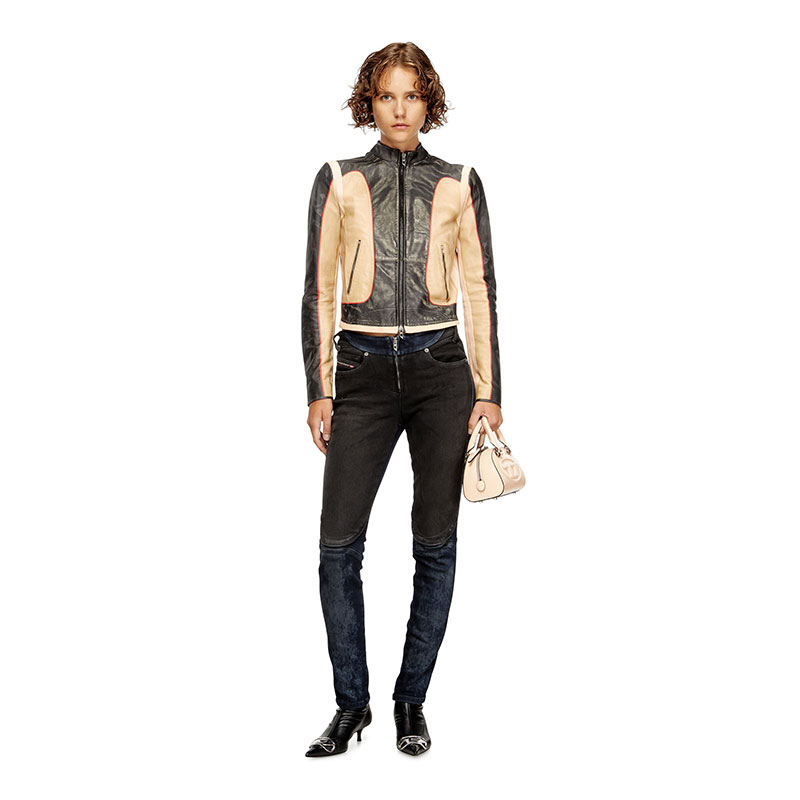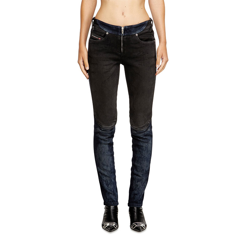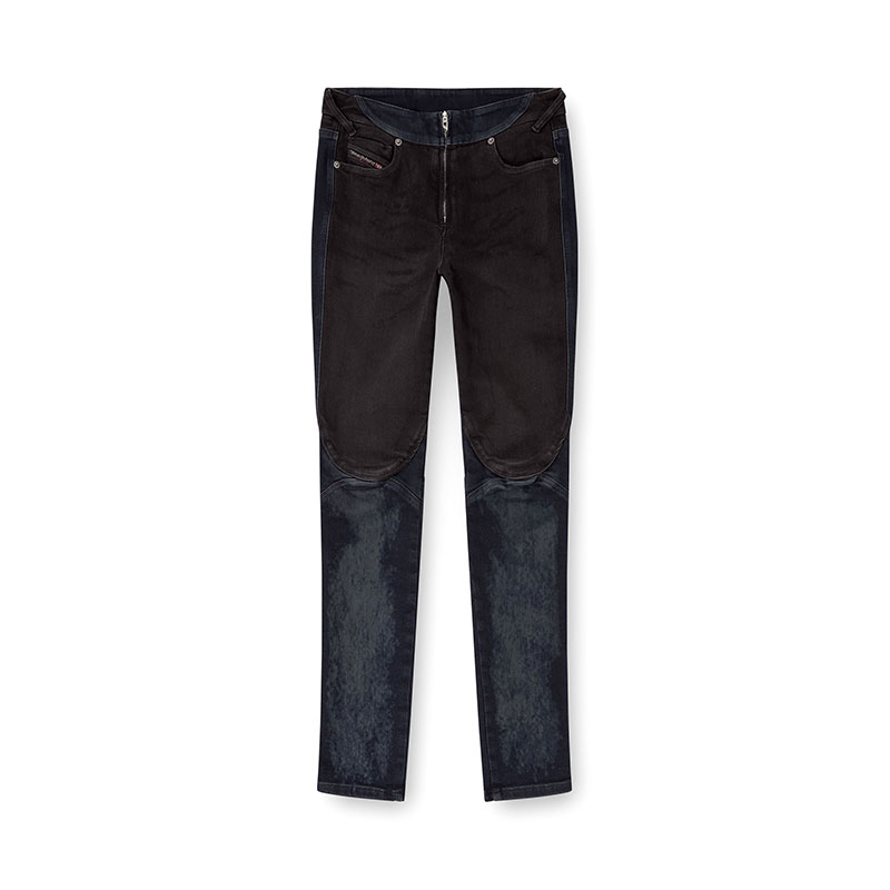 Inspired by Diesel’s heritage and continuous innovation, this bicolour wash channels a bold biker aesthetic. Crafted from super stretch denim in organic cotton, it combines two contrasting washes – dark blue and black – that enhance the construction of the garment. Lasered whiskers with a striking negative effect, and a total fade black treatment achieve an authentic worn-in effect.