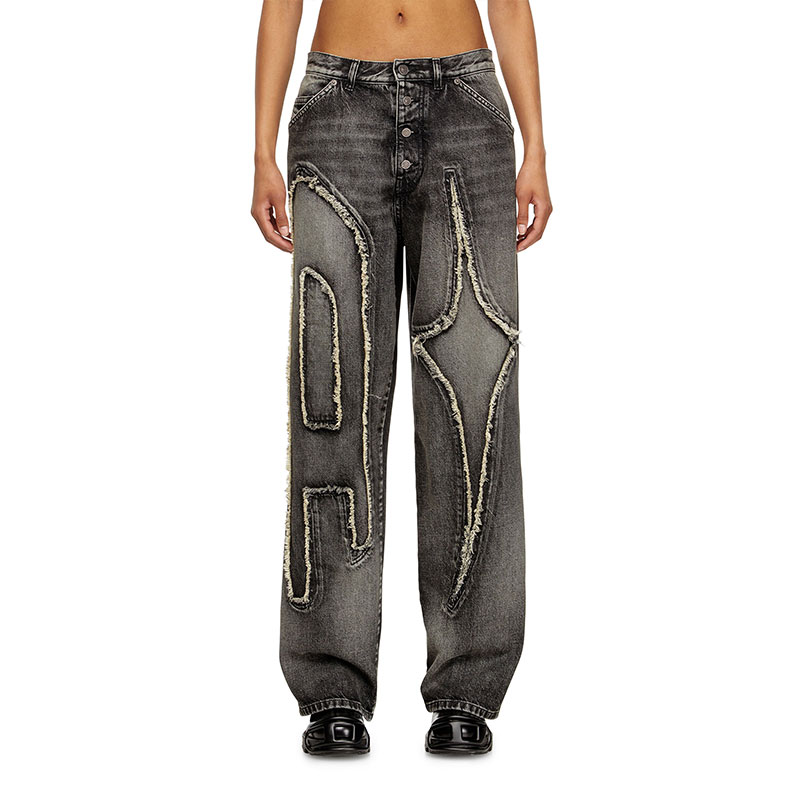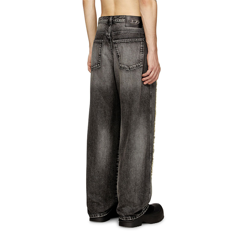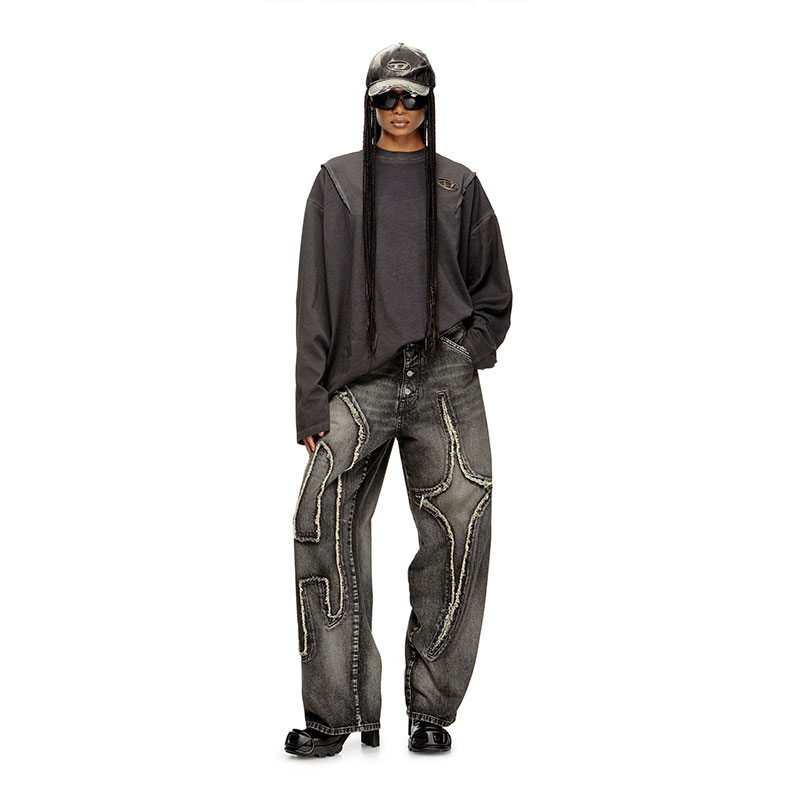 This exclusive black fix denim in 100% cotton undergoes a stone wash and signature treatments to reveal a natural marbled fade, traced with subtle wear marks. Each leg is dominated by oversized branding — Diesel’s D and Thug Club’s symbol — inlaid into the denim in frayed, raised relief. A collaboration made manifest: stark and subversive. Finished with a leather Diesel x Thug Club patch on the back.