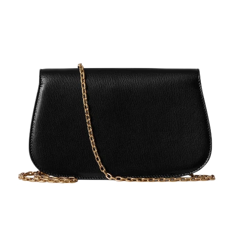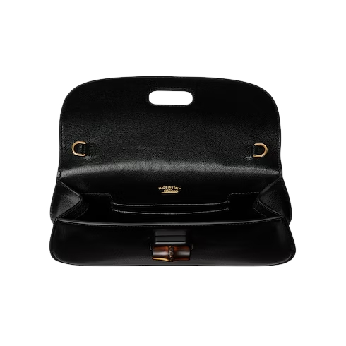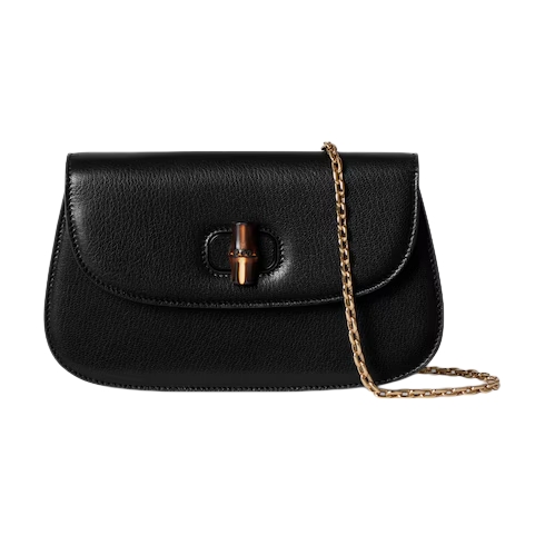 Introducing Spring Summer 2026. New small leather goods designs pay tribute to the Gucci Bamboo 1947 in a contemporary way. This clutch features an innovative closure mechanism which clicks open or close in two positions, and is complete with a chain strap.