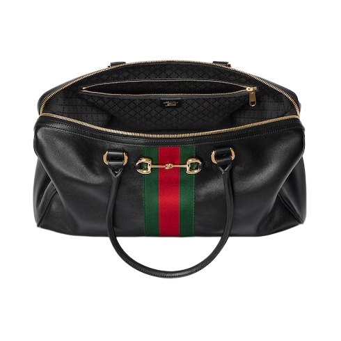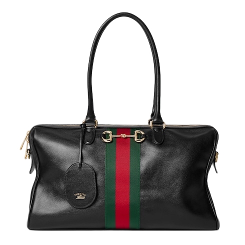 Horsebit, Web, and leather tag with "Made in Italy Gucci" logo