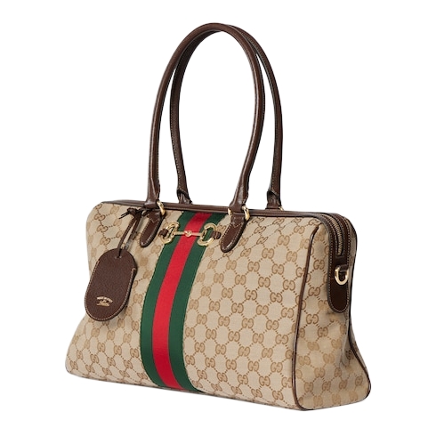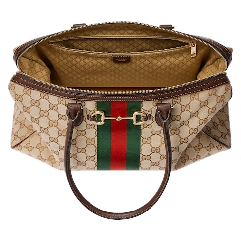 Introducing Spring Summer 2026. Borsetto is a wordplay that merges "borsa" (bag in Italian) and "morsetto" (Horsebit). The style is crafted from lightweight yet structured GG canvas in the vintage-inspired shade of sand, and reveals a new lining with Diamante motif taken from the archive.