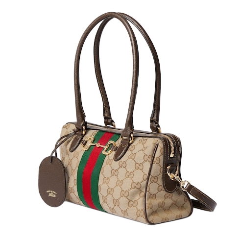 Horsebit, Web, and leather tag with "Made in Italy by Gucci" logo