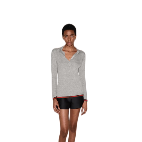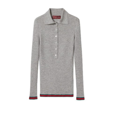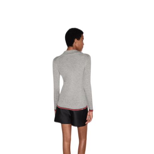 Gucci's House codes continue to evolve for the Cruise 2025 collection across relaxed jersey pieces. Crafted from an extra fine cashmere and silk rib, this polo top reveals a Gucci intarsia and reveals a green and red Web trim across the cuffs and hem.