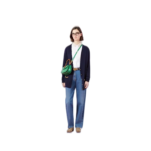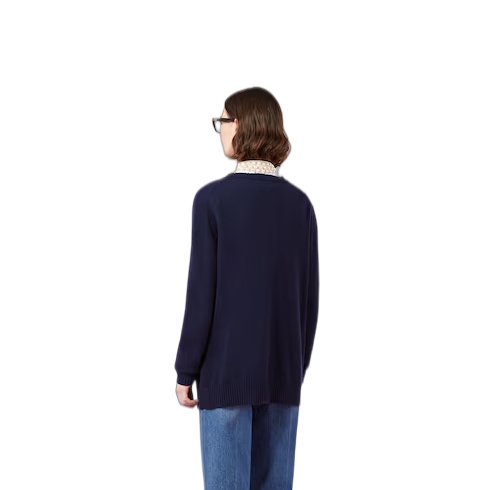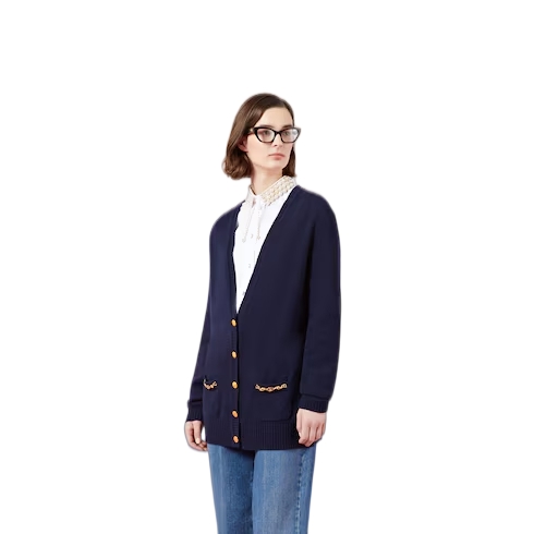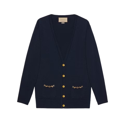 Crafted from dark blue cashmere, this cardigan is enriched by the chain detail at the pockets. Symbols that draw upon the illustrious history of Gucci adorn pieces throughout the Ouverture collection. Archive codes mix with streamlined silhouettes, creating a new vision for staple knitwear pieces.