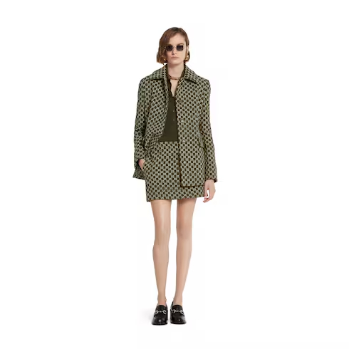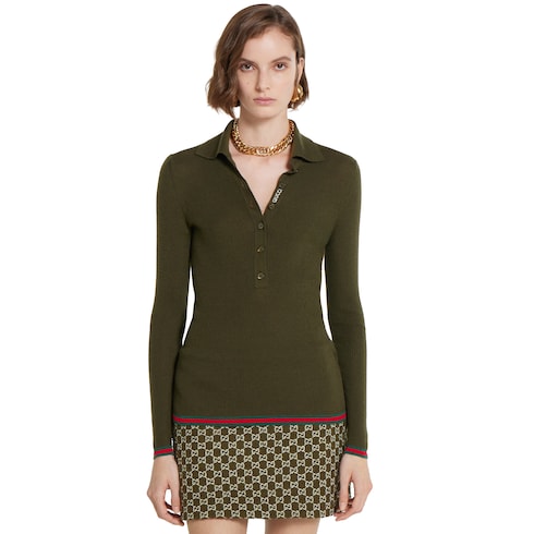 Gucci's House codes continue to evolve for Pre-Fall 2025 across relaxed knitwear pieces. Crafted from an extra fine cashmere and silk rib, this polo top reveals a Gucci embroidered detail on the front and reveals a green and red Web trim across the cuffs and hem.