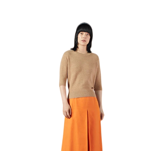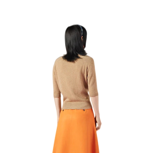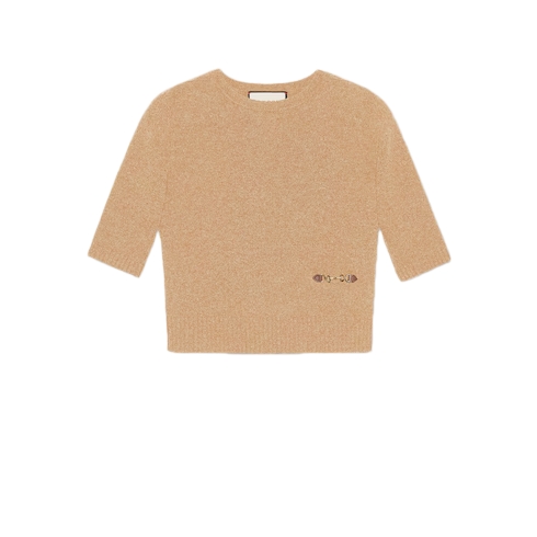 Classic knitwear designs in sophisticated color schemes are enriched by refined details and emblematic House codes. Crafted from beige soft cashmere, this short-sleeved crewneck top features the gold-toned metal Horsebit—a notable Gucci symbol borrowed from the equestrian world—paired with subtle leather details.
