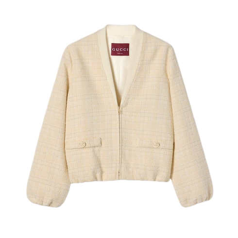 The Cruise 2026 women's ready-to-wear collection celebrates the Gucci wardrobe, blending archival influence with the history of Florence in a playful mélange, ranging from the minimal to the maximal. Crafted from check cotton tweed, this jacket is finished with Interlocking G metal buttons.