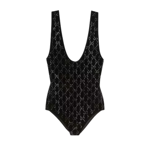 The Cruise 2026 women's ready-to-wear collection highlights sumptuous materials on essential silhouettes to usher in the festive season. Crafted from viscose chenille, this bodysuit is enriched with GG crystals.