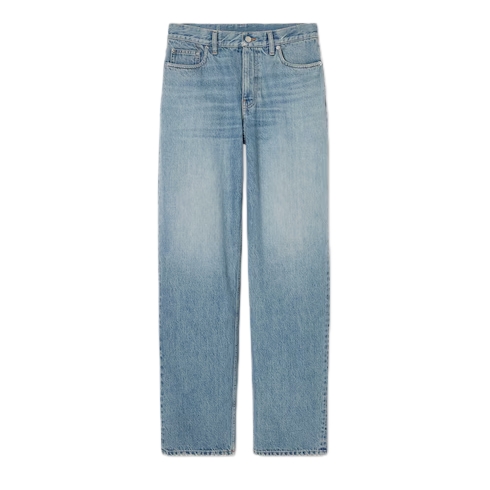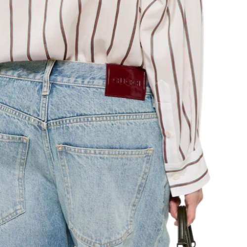 The Cruise 2026 women's ready-to-wear collection celebrates the Gucci wardrobe, blending archival influence with the history of Florence. Cut from a washed certified cotton denim, these pants with a five-pocket style are finished with a naplak label.