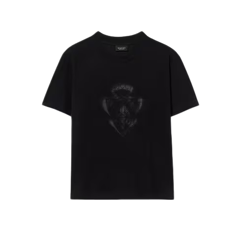 Introducing Spring Summer 2026. This style is part of the La Famiglia collection, which reinterprets the House’s codes through singular personalities and distinctive aesthetic attitudes. Crafted from light cotton jersey, this T-shirt is enriched with a Gucci crest devoré detail.
