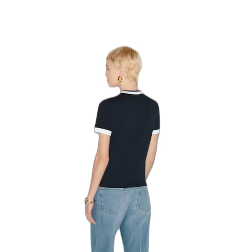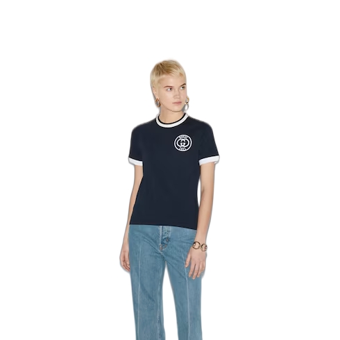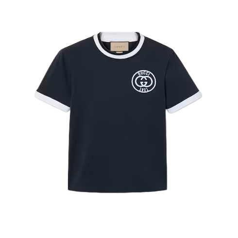 Inspired by the summer spirit and beach clubs on the Italian coast, this item is part of Gucci Lido. Gucci's interpretation of activewear comes through in its Interlocking G logo in the new collection. The subtle motif adorns this navy medium cotton jersey T-shirt, channelling a refined aesthetic.