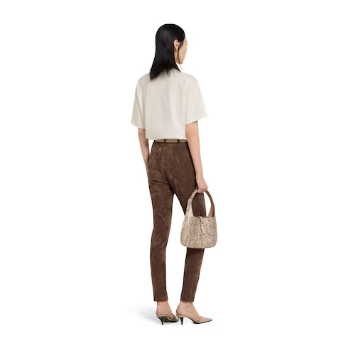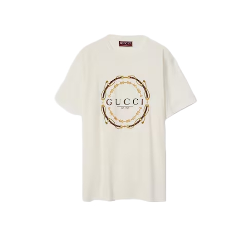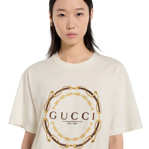 In the Cruise 2026 collection, women's ready-to-wear pieces celebrate the Gucci wardrobe, blending archival influence with the history of Florence in a playful mélange, ranging from the minimal to the maximal. Crafted from cotton jersey, this T-shirt is defined by a Gucci bridles 'Est 1921' print.