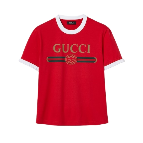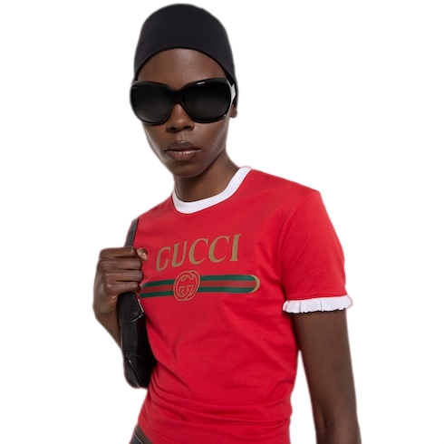 Introducing Spring Summer 2026. This style is part of the La Famiglia collection, which reinterprets the House’s codes through singular personalities and distinctive aesthetic attitudes. Crafted from cotton jersey, this T-shirt is defined by a Gucci Web with Interlocking G print.