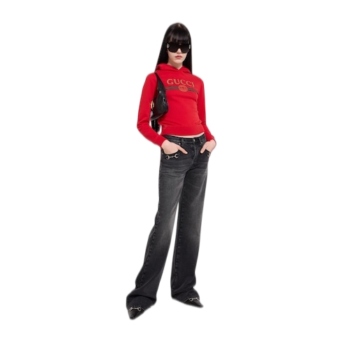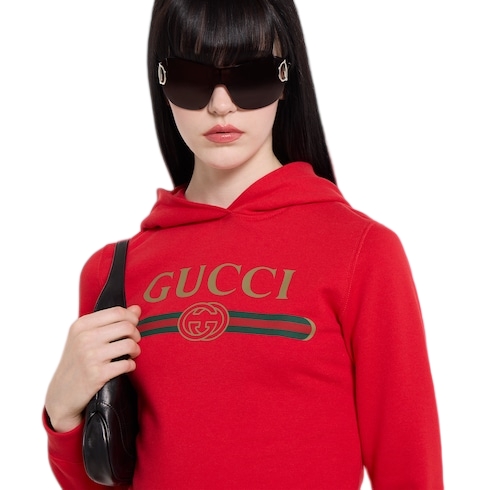 Introducing Spring Summer 2026. This style is part of the La Famiglia collection, which reinterprets the House’s codes through singular personalities and distinctive aesthetic attitudes. Crafted from cotton jersey and cashmere, this sweatshirt is enriched with a Gucci Web with Interlocking G print.