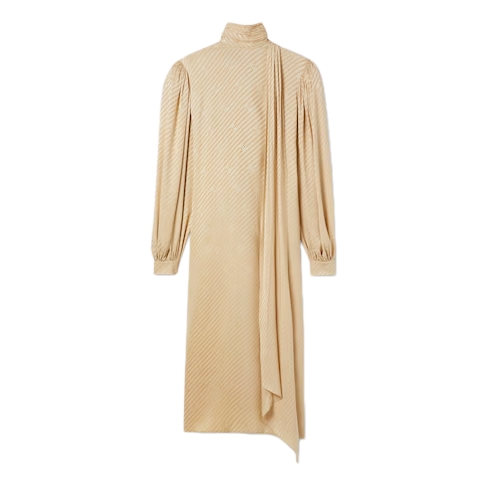 In the Cruise 2026 collection, structure meets sensuality in wide-shoulder silhouettes that command attention. Crafted from diagonal GG silk jacquard, this dress features long puff sleeves and a self-tie neck bow, bringing a romantic touch to the piece.