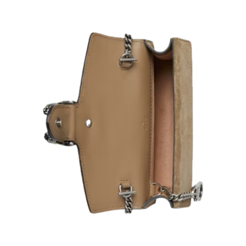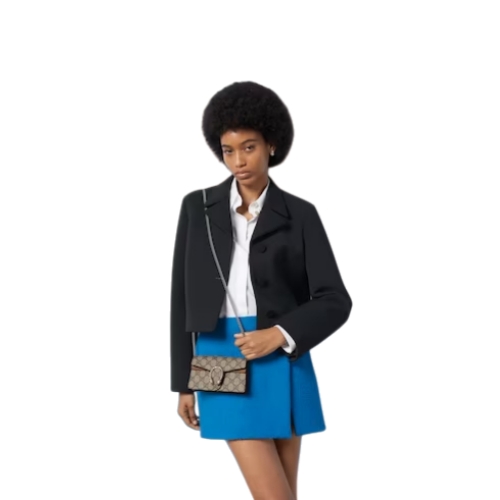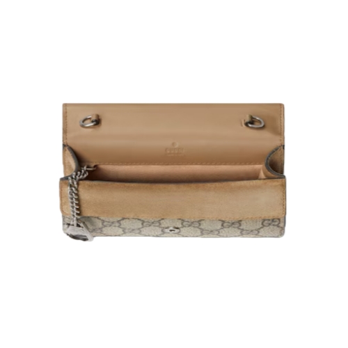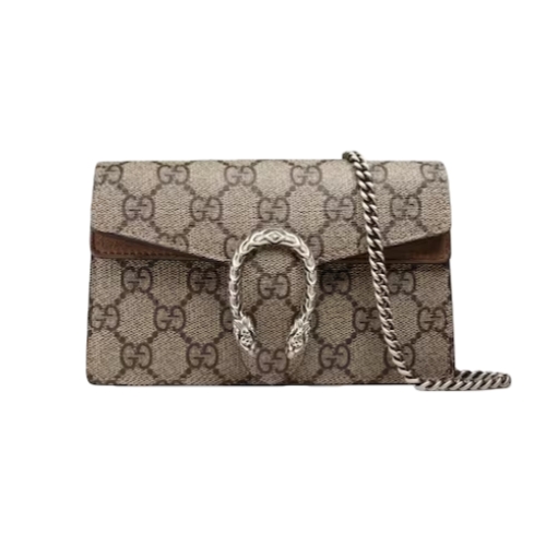 A structured GG Supreme canvas chain mini shoulder bag with a key ring that can be used to attach this bag to a separate larger bag. The closure has the textured tiger head spur closure-a unique detail referencing the Greek god Dionysus, who in myth is said to have crossed the river Tigris on a tiger sent to him by Zeus. The accessory can also be worn as a crossbody bag.