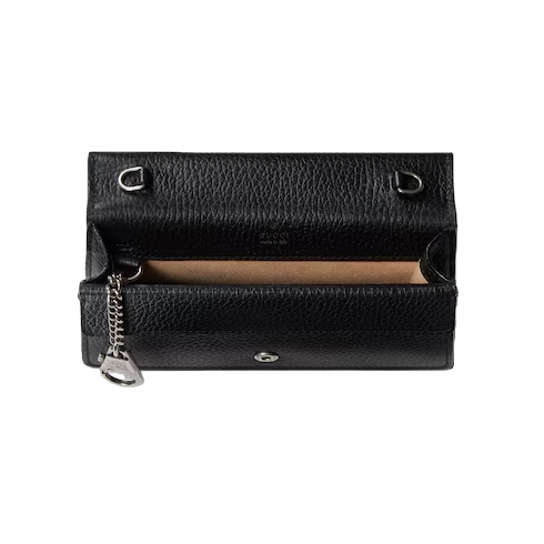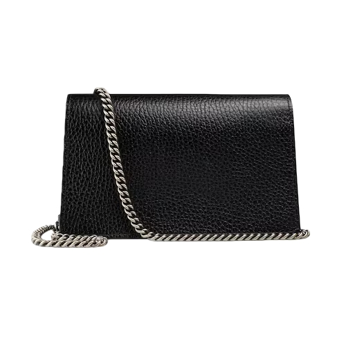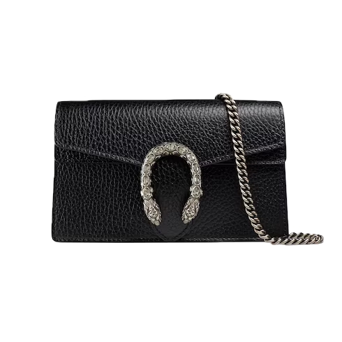 A structured leather chain mini bag with a key ring that can be used to attach this bag to a separate larger bag. The closure has the textured tiger head spur closure-a unique detail referencing the Greek god Dionysus, who in myth is said to have crossed the river Tigris on a tiger sent to him by Zeus. The tiger head closure is enriched with Swarovski crystal stones. Made in resistant textured leather.