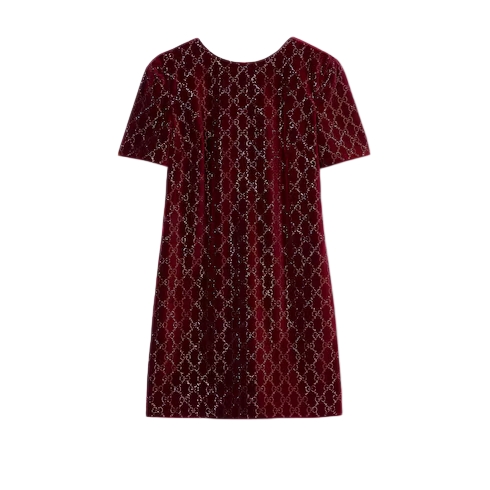 Crystal embellishment is featured in attires that glow from day to night, revisiting signature motifs such as the GG pattern and Horsebit motif. Crafted from stretch cotton velvet, this dress features an allover GG crystal embroidery.