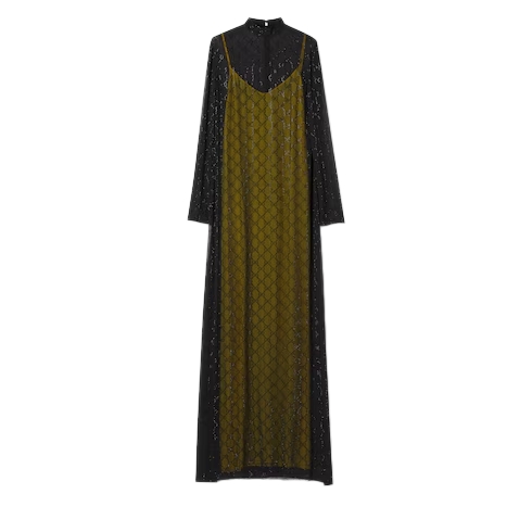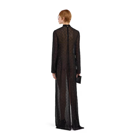 In the Cruise 2026 collection, crystal embellishments illuminate looks that transition effortlessly from day to night, revisiting signature motifs such as the GG pattern and Horsebit motif. Crafted from lightweight black silk georgette, this long dress is defined by an allover GG crystal embroidery.