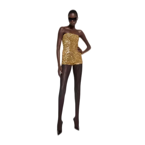 Introducing Spring Summer 2026. This style is featured as part of the "La Bomba" look of La Famiglia, which interprets the House's codes through singular personalities and distinctive aesthetic attitudes. This jumpsuit is presented in gold embroidered sequin elastic fabric.