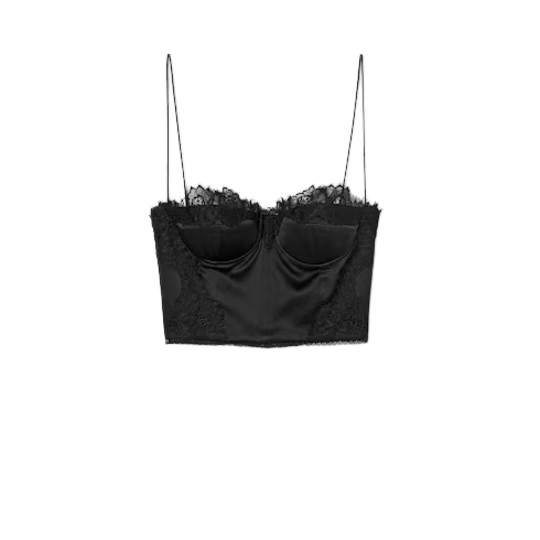 Introducing Spring Summer 2026. This style is inspired by the "La Diva" look of La Famiglia. The collection reinterprets the House’s codes through singular personalities and distinctive aesthetic attitudes. Crafted from silk satin, this top is defined by an allover lace embroidery.