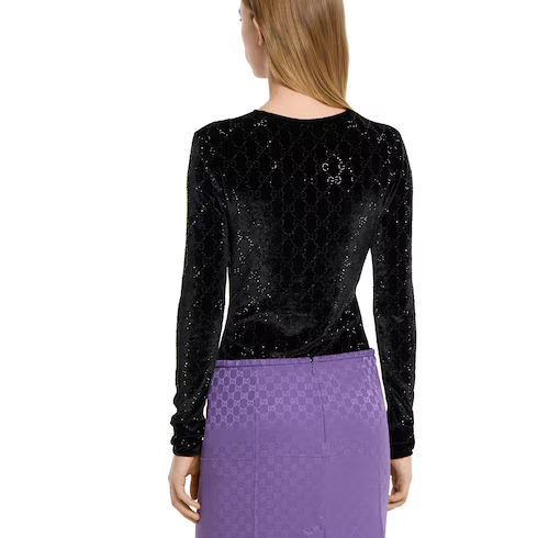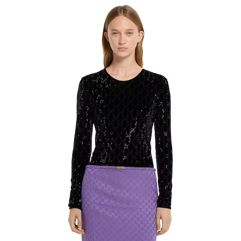 In the Fall Winter 2025 collection, a stretch chenille long sleeve top is reimagined with a luminous finish. The style features a classic crewneck and is embellished with allover GG crystal embroidery, combining signature codes with a contemporary touch.