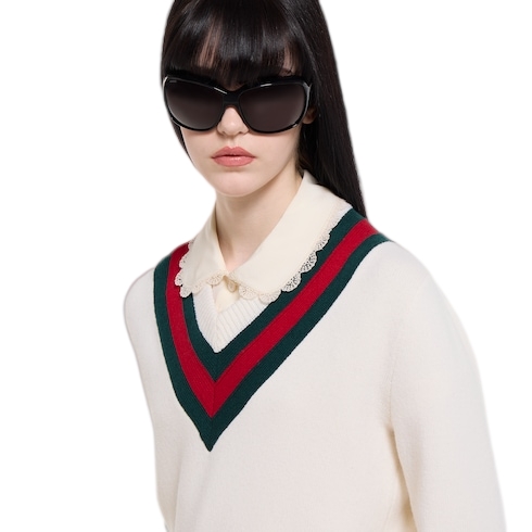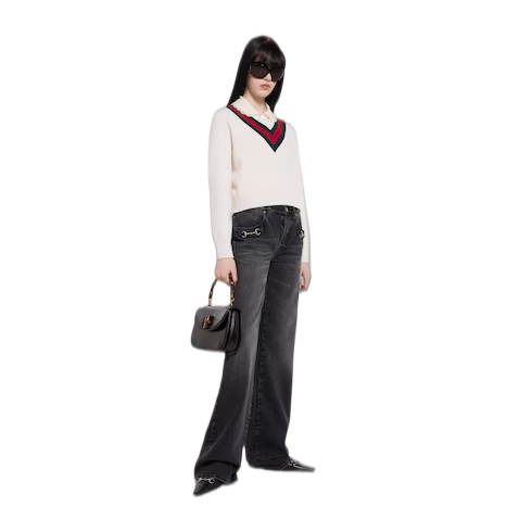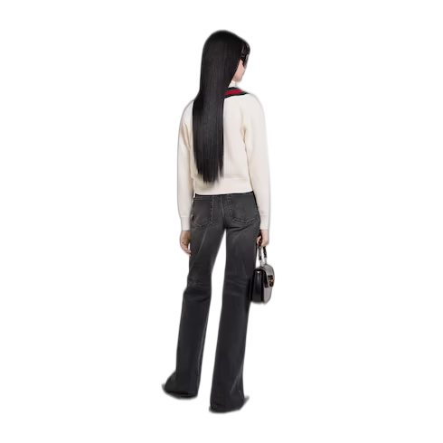 Introducing Spring Summer 2026. This style is inspired by the "L'Influencer" look of La Famiglia. The collection reinterprets the House’s codes through singular personalities and distinctive aesthetic attitudes. Crafted from fine knit wool, this sweater is enriched with a Web detail at the neck.