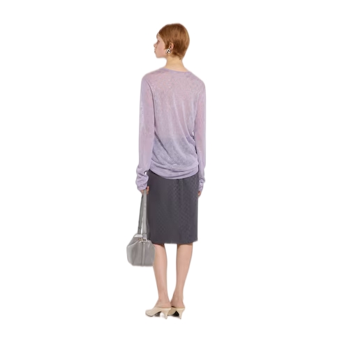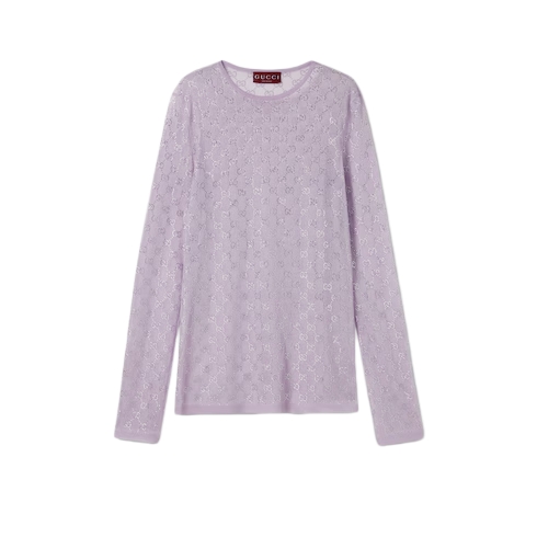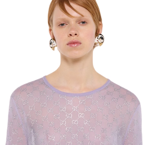 In the Cruise 2026 collection, crystal embroidery creates a sparkling contrast with the texture of emblematic fabrics of the House. Crafted from fine silk, this T-shirt is enriched with allover GG crystals.