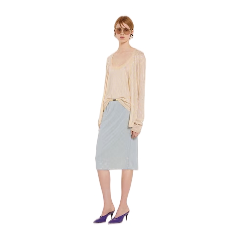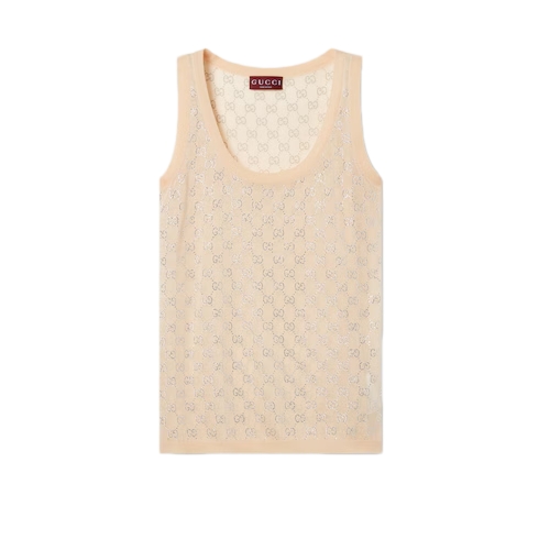 In the Cruise 2026 collection, crystal embroidery creates a sparkling contrast with the texture of emblematic fabrics of the House. Crafted from fine silk, this tank top is enriched with allover GG crystals.