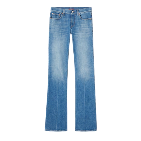 The Cruise 2026 women's ready-to-wear collection celebrates the Gucci wardrobe, blending archival influence with the history of Florence. Cut from a stone washed certified stretch cotton denim, these pants with a five-pocket style are finished with a naplak label.