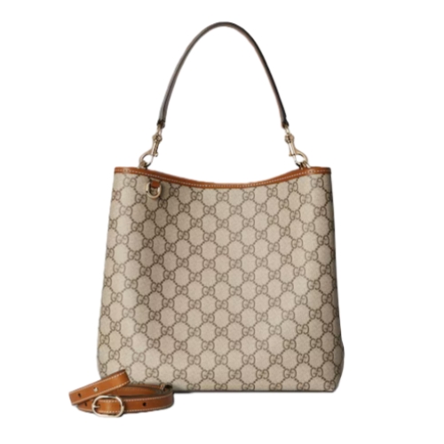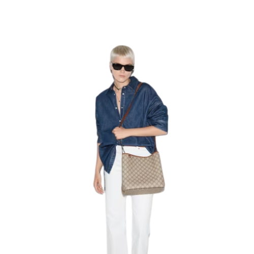 The new GG Emblem collection reinterprets the House’s history of elegance and craftsmanship. This bucket bag highlights a functional design with two main compartments in Web cotton lining and a zip pocket in the middle.