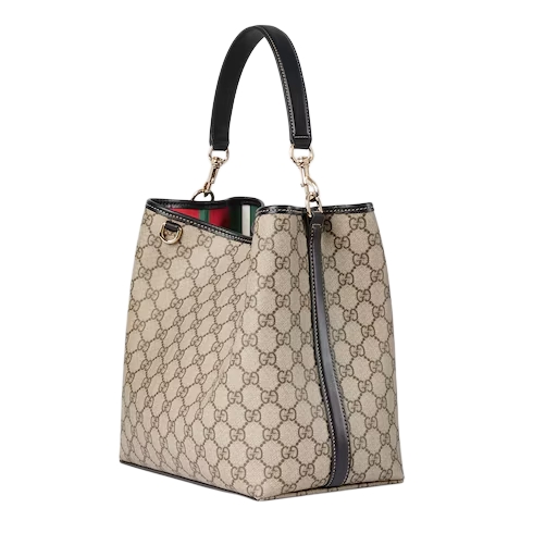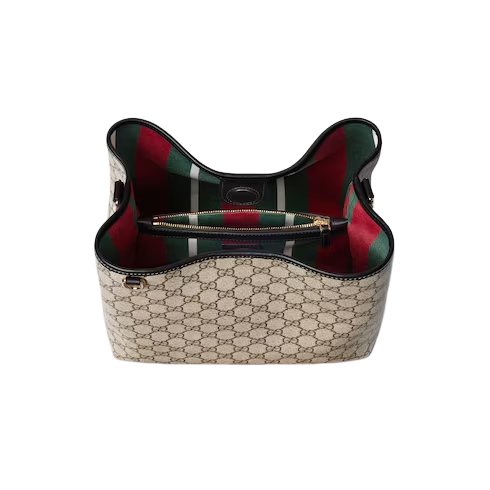 The new GG Emblem collection reinterprets the House’s history of elegance and craftsmanship. This bucket bag highlights a functional design with two main compartments in Web cotton lining and a zip pocket in the middle.