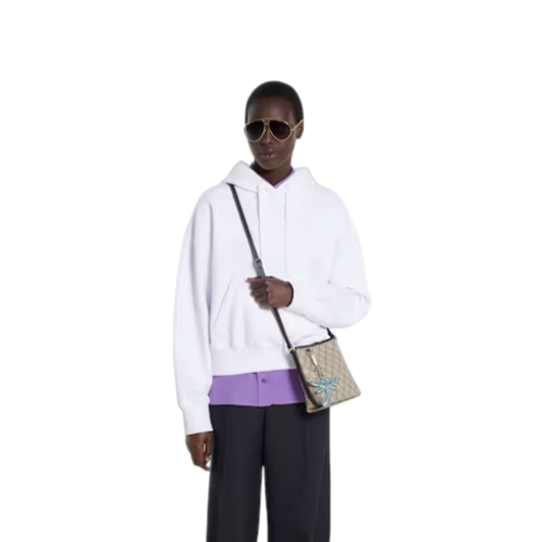 In the Fall Winter 2025 collection, part of the new GG Emblem collection, this mini bucket bag reinterprets House codes through a functional lens. Characterized by a compact silhouette and refined details, it features a long shoulder strap for comfortable wear, making it a versatile option from day to evening.