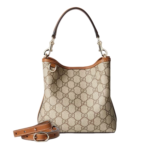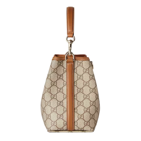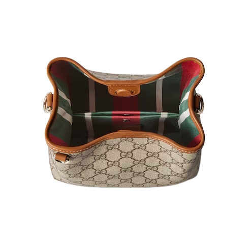 The new GG Emblem collection reinterprets the House’s history of elegance and craftsmanship. This bucket bag highlights functional design with an interior compartment, in Web cotton lining.