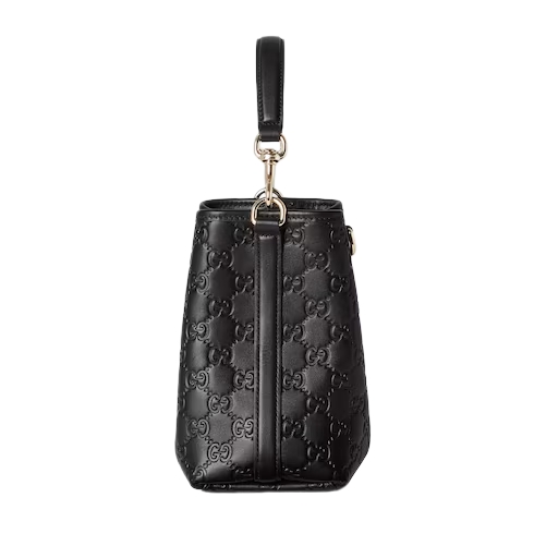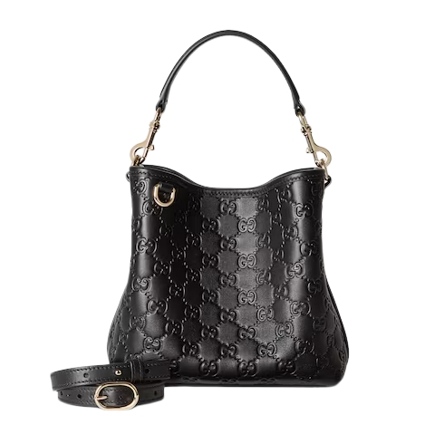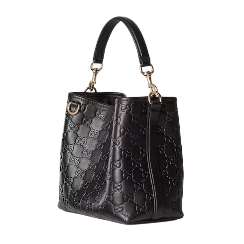 The GG Emblem collection reinterprets the House’s history of elegance and craftsmanship. This bucket bag highlights functional design with an interior compartment, in Web cotton lining.