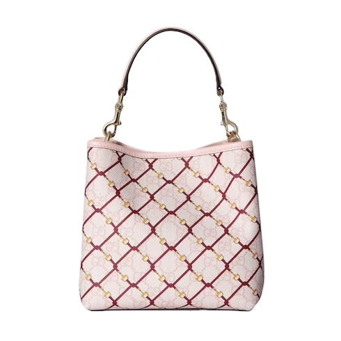 The GG Emblem collection reinterprets the House’s history of elegance and craftsmanship. Highlighting a stirrup motif over the GG Monogram coated fabric, this bucket bag enriches functional design with an interior compartment in Web cotton lining.