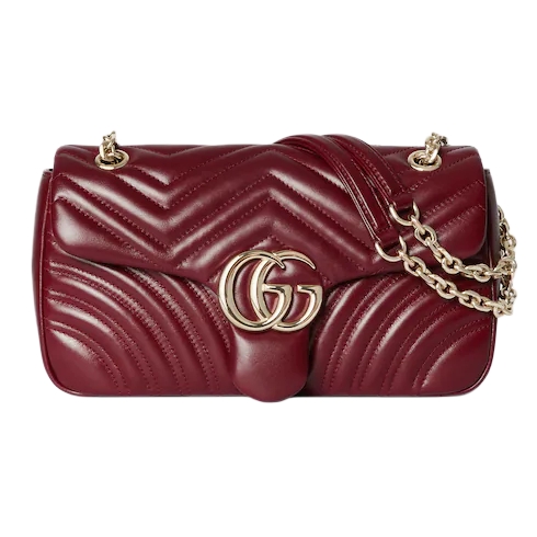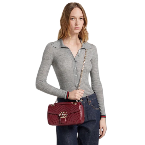 The GG Marmont, a signature collection of the House, features the Double G hardware, a faceted chain strap, and soft construction in an exceptionally supple leather. A sleek back pocket introduces a functional touch to the medium and large sizes.