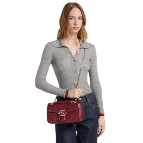 The GG Marmont, a signature collection of the House, features the Double G hardware, a faceted chain strap, and soft construction in an exceptionally supple leather. A sleek back pocket introduces a functional touch to the medium and large sizes.