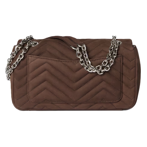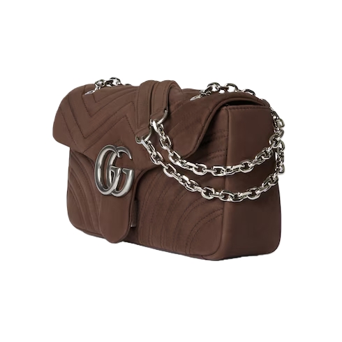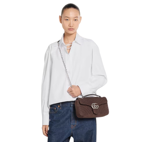 The GG Marmont, a signature collection of the House, features the Double G hardware, a faceted chain strap, and soft construction. A sleek back pocket introduces a functional touch to the medium and large sizes.