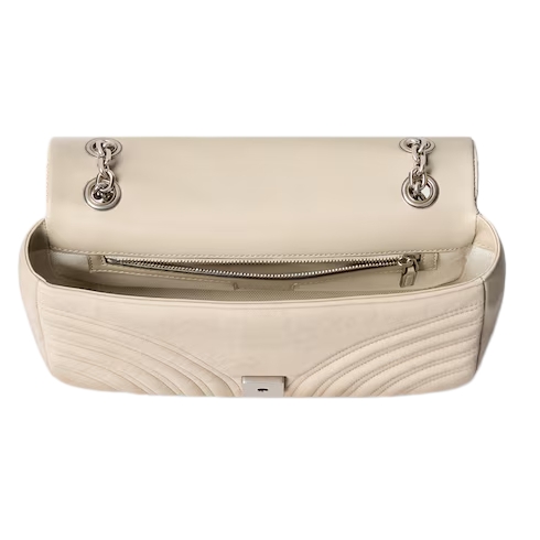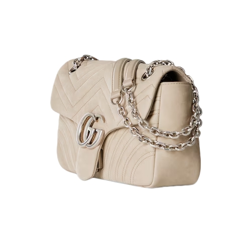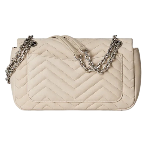The GG Marmont, a signature collection of the House, features the Double G hardware, a faceted chain strap, and soft construction. A sleek back pocket introduces a functional touch to the medium and large sizes.