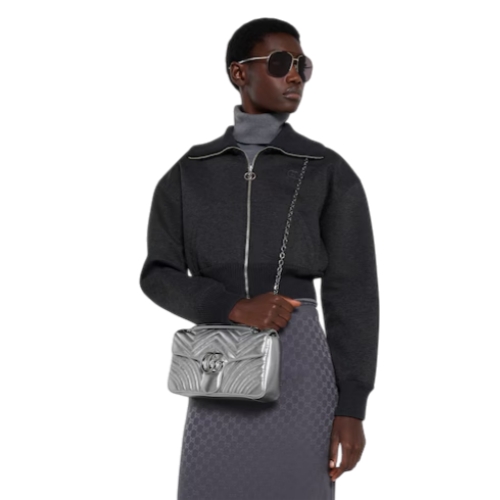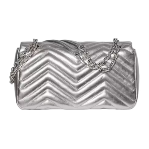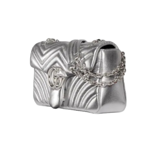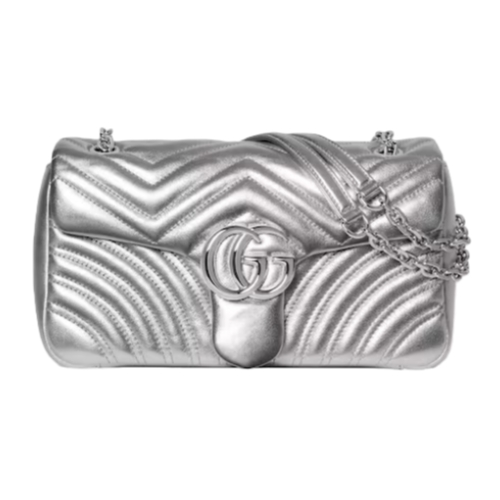 The GG Marmont, a signature collection of the House, features the Double G hardware, a faceted chain strap, and soft construction, introducing lamé leather on this shoulder bag silhouette.