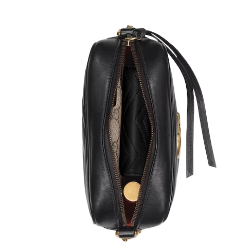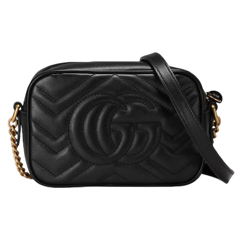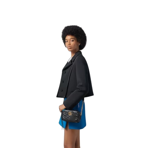 The mini GG Marmont chain shoulder bag has a softly structured shape and a zip top closure with Double G hardware. The chain shoulder strap has a leather shoulder detail. The camera bag is made in matelassé leather with a chevron design and GG on the back.