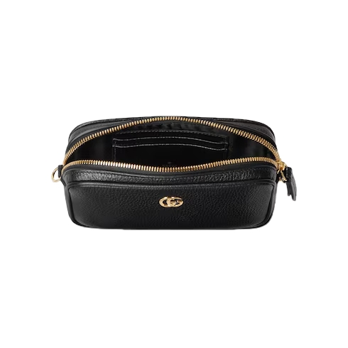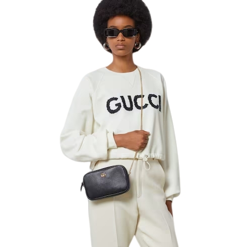 The GG Marmont collection is defined by the emblematic Double G gold-toned hardware, a contemporary take on a Gucci archival motif. This black leather camera bag with a chain strap and zip closure reveals two card slots inside for effortless organization.