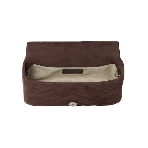 The GG Marmont, a signature collection of the House, features the Double G hardware, a faceted chain strap, and nubuck leather with a soft touch and sophisticated feel. This mini bag is complete with the archival logo, first introduced in the 1970s.