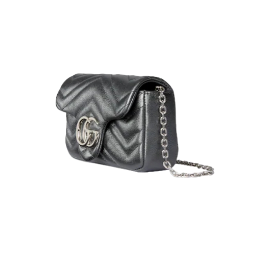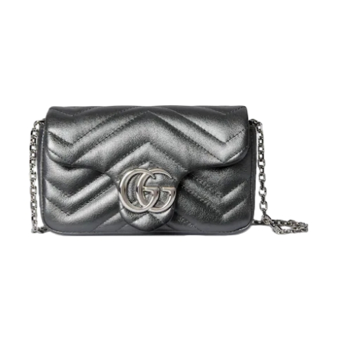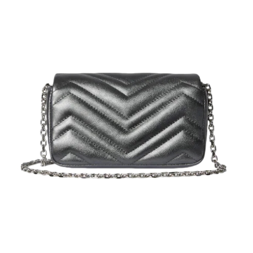 The GG Marmont, a signature collection of the House, features the Double G hardware, a faceted chain strap, and soft construction, introducing lamé leather on this shoulder bag silhouette.