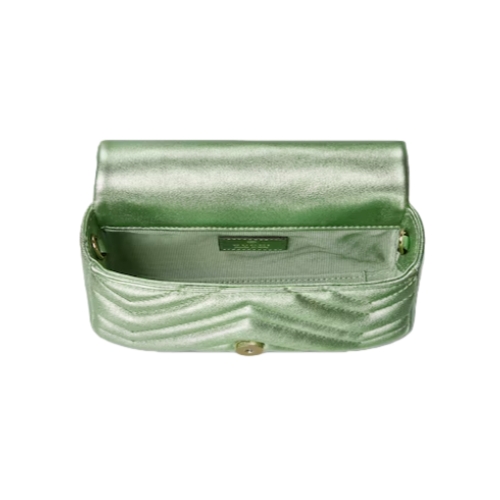 The GG Marmont, a signature collection of the House, features the Double G hardware, a faceted chain strap, and soft construction, introducing lamé leather on this shoulder bag silhouette.
