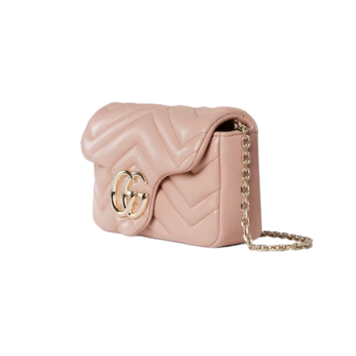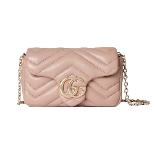 The GG Marmont introduces mini silhouettes in a fresh palette, such as this mini shoulder bag in pink beige matelassé chevron leather, complete with the Double G hardware in a light gold-toned finish.